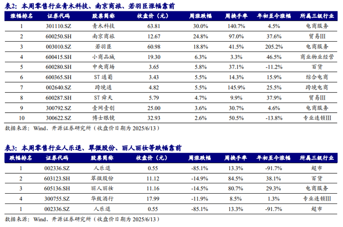 本周(6月9日-6月13日),商贸零售指数报收2120.43点,下跌1.49%,跑输上证综指(本周下跌0.25%)1.24个百分点,板块表现在31个一级行业中位居第25位。零售各细分板块中,本周钟表珠宝板块涨幅最大,2025年年初至今钟表珠宝板块领跑。个股方面,本周青木科技(+30.0%)、南京商旅(+24.8%)、若羽臣(+18.8%)涨幅靠前。