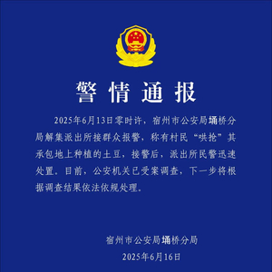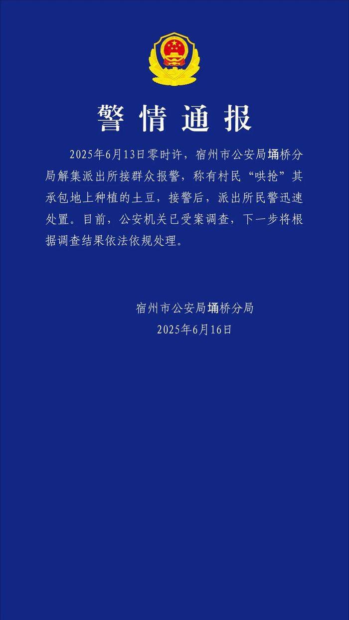 6月16日晚,安徽宿州市公安局埇桥分局发布警情通报:6月13日零时许,宿州市公安局埇桥分局解集派出所接群众报警,称有村民“哄抢”其承包地上种植的土豆,接警后,派出所民警迅速处置。目前,公安机关已受案调查,下一步将根据调查结果依法依规处理。