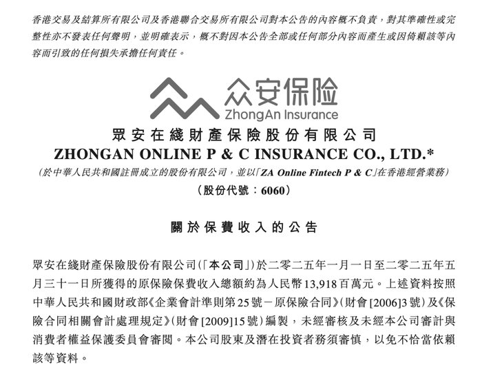 众安在线前五月原保险保费收入近139亿元 该保险总保费同比增长13%