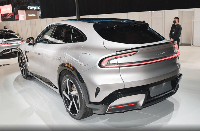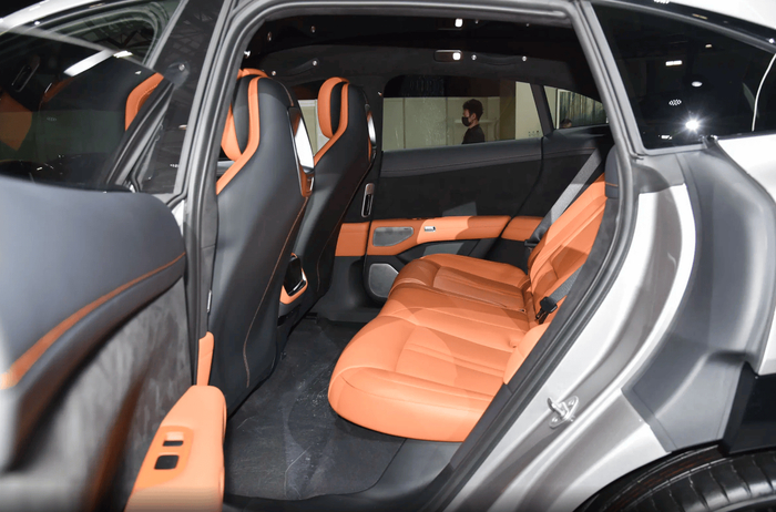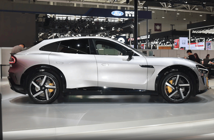 特别是看车身侧面造型方面就很清晰,这款SUV显然是采用了相对传统的长车头设计,这样确实可以营造出类似传统豪华品牌的感觉,但说实话现在这种纯电动车型根本没有发动机舱,其实整个前车头位置是有点浪费的,当然车头部分做成了前备箱也提供了储物能力,但这种运动姿态的造型,后排空间相对来说就没有同级别领域那么大了。