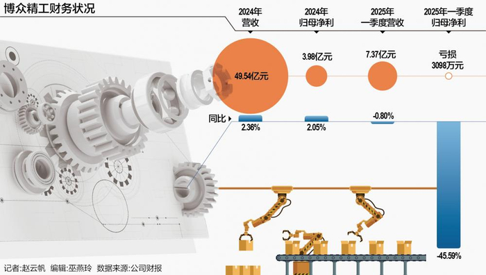 财报显示,博众精工2024年实现营业收入49.54亿元,同比仅微增2.36%;归属母公司股东净利润3.98亿元,同比微增2.05%;扣除非经常性损益的净利润则下滑2.66%。