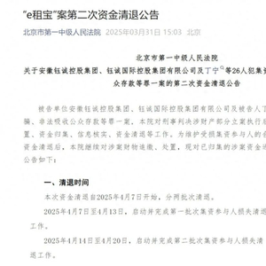 九派新闻搜索发现,今年3月31日,北京市第一中级法院发布了“e租宝”案第二次资金清退公告,称本次资金清退自2025年4月7日至2025年4月20日,分两批次清退。资金清退对象为在“e租宝”和“芝麻金融”网络平台参与集资的受损集资参与人,但没有提到具体的清退比例。