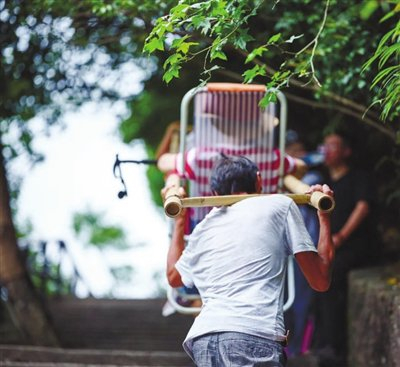 几年前一次爬山时,几个朋友犹豫了一阵,还是决定坐“滑竿”上山,为的是节省时间和体力。滑竿有点像担架,是用两根粗竹竿作支架,两竹竿中间有固定座椅,由前后两个轿夫托举起来的简易抬人上山的专用轿子,在陡峭和狭窄的山路上,这个很实用。
