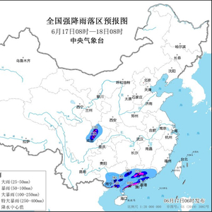 预计6月17日08时至18日08时,广东大部、广西中南部、四川盆地西北部等地部分地区有大到暴雨,其中,广东中部和西南部沿海、广西东南部沿海、四川盆地西北部等地部分地区有大暴雨,广东西南部沿海局地特大暴雨(250~400毫米)。上述部分地区伴有短时强降水(最大小时降雨量20~50毫米,局地可超过70毫米),局地有雷暴大风等强对流天气。中央气象台6月17日06时继续发布暴雨蓝色预警。