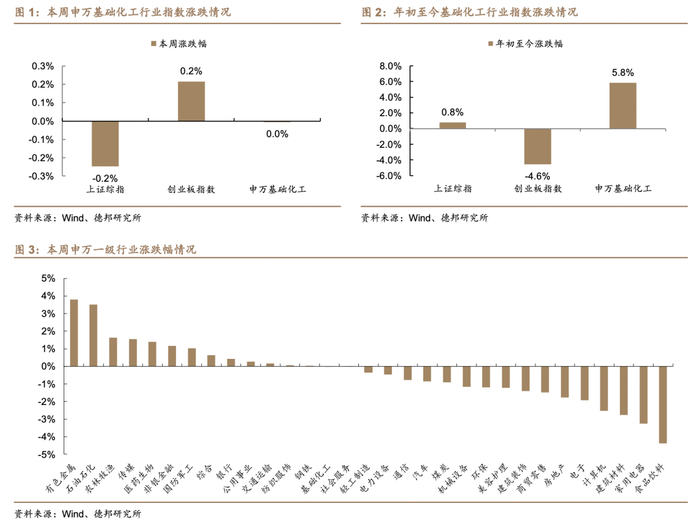 本周申万基础化工行业指数环比持平。根据Wind,本周(6/6-6/13)上证综指涨跌幅为-0.2%,创业板指数涨跌幅为+0.2%;申万基础化工行业指数涨跌幅为0%,在全部31个行业板块中位列第14位,跑赢上证综指0.2个百分点,跑输创业板指数0.2个百分点。年初至今,上证综指涨跌幅为+0.8%,创业板指数涨跌幅为-4.6%;申万基础化工行业指数涨跌幅为+5.8%,跑赢上证综指5.1个百分点,跑赢创业板指数10.4个百分点。