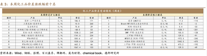 本周化工品价差跌幅前十名为:尿素-LNG价差(-110元/吨)、Brent-WTI期货主连合约价差(-2美元/桶)、丙烯-丙烷价差(-33美元/吨)、MTO价差(乙烯-甲醇)(-201元/吨)、DMF-甲醇-液氨价差(-128元/吨)、二甲醚-甲醇价差(-91元/吨)、MTO价差(丙烯-甲醇)(-245元/吨)、双酚A-苯酚-丙酮价差(-470元/吨)、二甲胺-甲醇-液氨价差(-192元/吨)、丙烯-石脑油价差(-49美元/吨)。