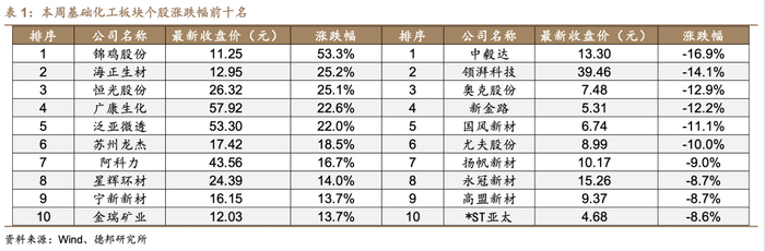 在基础化工板块424只股票中,本周174只股票上涨,244只股票下跌,6只股票持平。本周个股涨幅前十名分别为:锦鸡股份(+53.3%)、海正生材(+25.2%)、恒光股份(+25.1%)、广康生化(+22.6%)、泛亚微透(+22%)、苏州龙杰(+18.5%)、阿科力(+16.7%)、星辉环材(+14%)、宁新新材(+13.7%)、金瑞矿业(+13.7%)。本周个股跌幅前十名分别为:中毅达(-16.9%)、领湃科技(-14.1%)、奥克股份(-12.9%)、新金路(-12.2%)、国风新材(-11.1%)、尤夫股份(-10%)、扬帆新材(-9%)、永冠新材(-8.7%)、高盟新材(-8.7%)、*ST亚太(-8.6%)。
