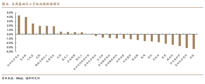 细分板块看,在基础化工26个子板块中,11个子板块上涨,15个子板块下跌。本周子版块涨跌幅前五名分别为:纺织化学用品(+4.3%)、复合肥(+4%)、无机盐(+2.5%)、氮肥(+2%)、磷肥及磷化工(+1.9%);本周子版块涨跌幅后五名分别为:粘胶(-3.4%)、其他化学原料(-3.1%)、非金属材料(-2.7%)、膜材料(-2.4%)、炭黑(-2.2%)。