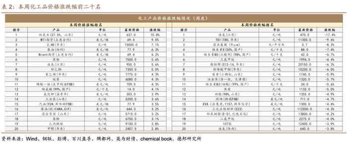 本周化工品价格涨幅前十名为:双氧水(27.5%,山东)(+10.8%)、WTI期货(主连合约)(+9.5%)、2,4D(华东)(+7.1%)、柴油(纽约)(+6.3%)、Brent期货(主连合约)(+6.2%)、苯胺(+5.6%)、液氩(江苏)(+5.6%)、环己酮(+5%)、苯乙烯(华东)(+4.3%)、纯苯(+4.3%)。