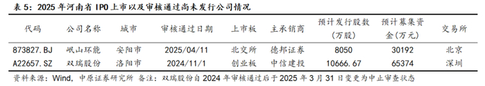 截至5月底,河南省IPO审核通过尚待发行公司1家,为拟在北交所上市的岷山环能。
