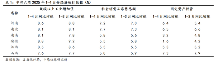 2025年1-4月份,中部各省经济运行热度略减但总体保持稳健。具体表现为六省工业生产有所回落但仍维持高位,社会消费略有扩张,固投力度普遍减弱。相比较而言,河南省经济的内生动能发力显著,驱动经济增势在中部六省中表现突出。
