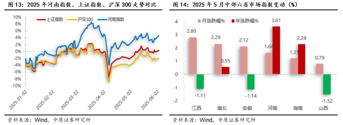 证券市场情况:2025年5月份,河南指数上涨1.64%,低于上证指数2.09%和沪深300指数1.85%。当月,豫A股涨幅前3位是花溪科技(74.52%)、棕榈股份(57.98%)、新天地(38.08%),豫H股涨幅前3位是宇华教育(73.33%)、伟业控股(38.69%)、福森药业(30.77%)。