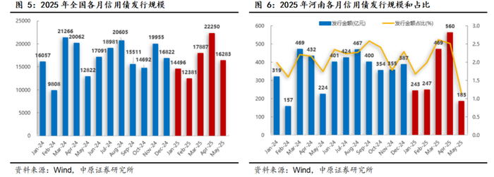 5月份,河南信用债券融资规模185亿元,为本年单月最低水平。Wind数据显示,5月份,河南省发行信用债发行35只,融资规模184.82亿元,环比下降66.99%;前5个月,累计发行287只信用债,融资规模1703.74亿元,同比增长收窄到6.44%,全国排名较前4个月下降2位、至第11位,中部六省第2位。