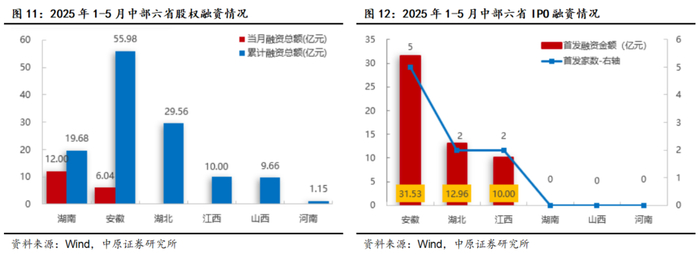 对比中部六省股权融资规模和数量,5月份,湖南、安徽省分别有1家公司增发和IPO上市,分布融资12亿元和6.04亿元。1-5月份,安徽有7家公司合计融资55.98亿元,居六省第一,其中有5单IPO,IPO数量居中部六省第一;湖北有4家公司融资29.56亿元,居六省第二;江西实现2单IPO,融资规模居六省第三;山西、湖南、河南分别有1家公司增发实现融资。