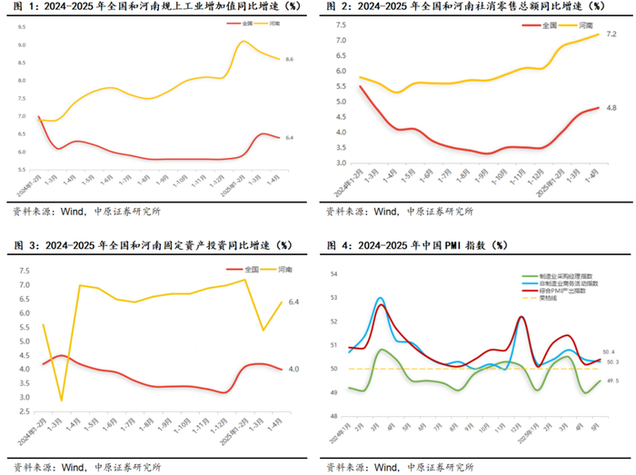 经济运行情况:2025年4月我国主要经济指标虽然受外部不确定性因素扰动有所回落,但在内生动力的支撑下仍然保持韧性;4月河南省工业生产维持高位,消费与投资加速增长,供强需弱格局得到改善,经济增长的内生动力明显增强;1-4月份中部各省经济运行热度略减但总体保持稳健,河南省经济的内生动能发力显著,驱动经济增势在中部六省中表现突出。