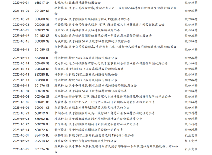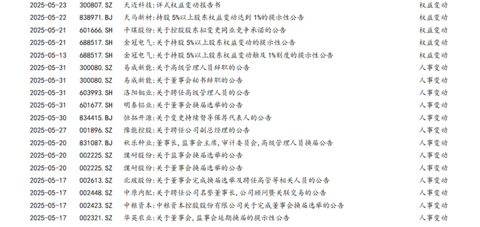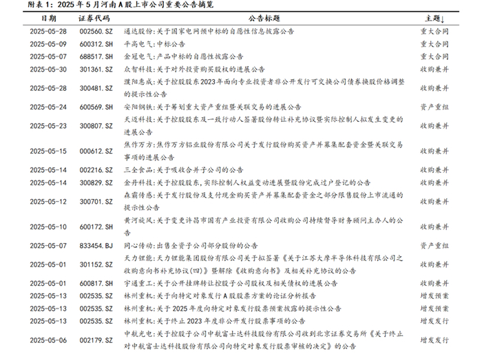 2025年5月份,河南上公司公告可重点关注重组和增发、股份减持以及人事变动等事项。例如:安阳钢铁等公司资产重组进展公告,林州重机重启增发公告,拓新药业、仲景食品、开普检测等公司股东减持股份公告,以及濮耐股份、中粮资本等公司董事会换届公告。详见“附表1:2025年5月份河南A股上市公司重点公告一览表”。