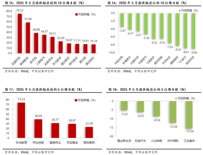 5月,豫H股表现居前的公司有宇华教育(73.33%)、伟业控股(38.69%)、福森药业(30.77%)等,居后的公司有卫龙美味(-15.54%)、向中国际(-12.28%)、兴业物联(-12.28%)等。