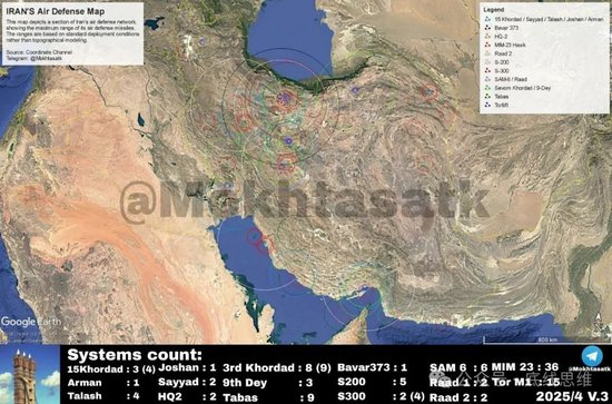 考虑到伊朗大部分关键设施位于德黑兰与伊斯法罕,伊朗防空武器的布置也集中于此,下图为外国osinter制作的2025年4月伊朗防空武器位置图。