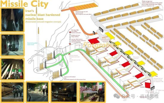 伊朗共有三种中导掩体类型。图1是最常见的一种,拥有预制开口和弹药储存库。这种发射井一般都是兼容固体弹和液体弹发射的(固体弹放在传送带里),由于液体弹需要进到井内起竖加注(图4)固上方开口较大,加之伊朗施工作业能力不强,没有装配足够强度的发射盖,而且不少直接开口裸奔,导致这种开口很容易被炸垮塌,伊朗很可能短时间内无法破障,导致反击不及时。