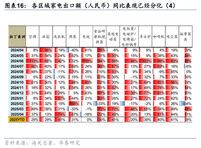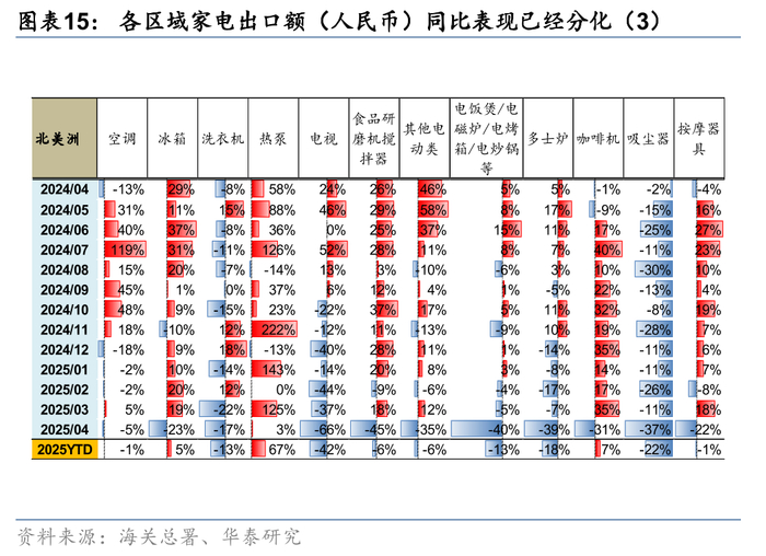 1) 家电内销:以旧换新拉动力延续,但由于需求前置,家电零售增速略弱于24Q4(据国家统计局数据,25M1-M4家电社零同比+23.9%),但内销占比较高的公司表现仍具备相对优势;