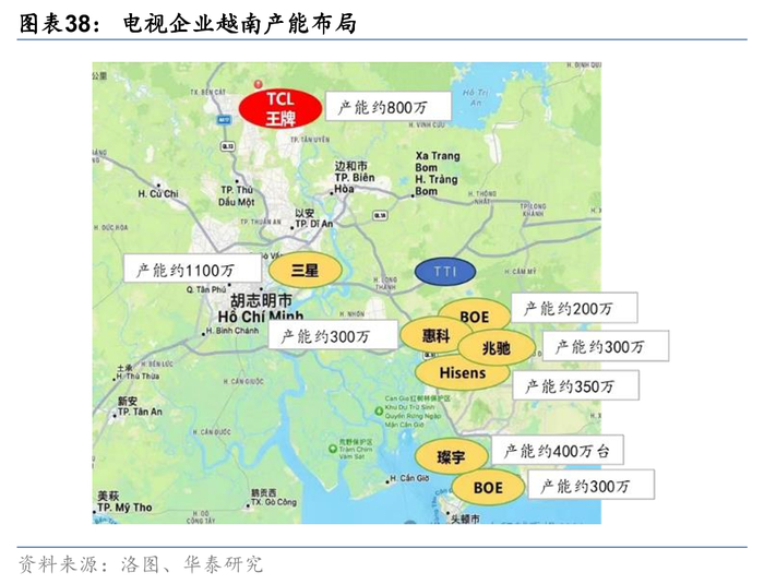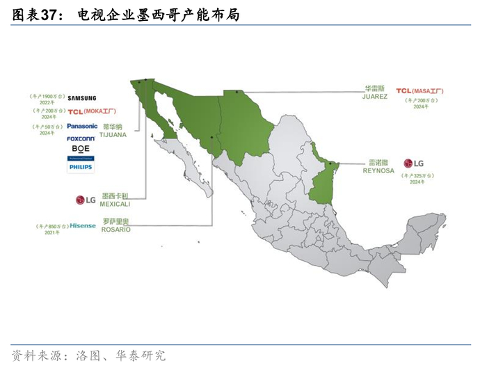 中国龙头电视企业海外布局充分,其中,海信视像墨西哥/越南产能约850/350万台/年、TCL墨西哥/越南产能约为200/800万台/年,质价比优势或推动中国品牌全球份额继续提升。