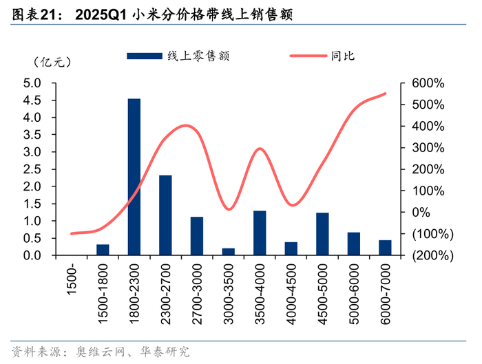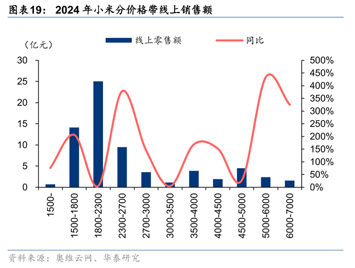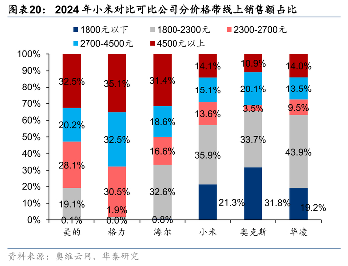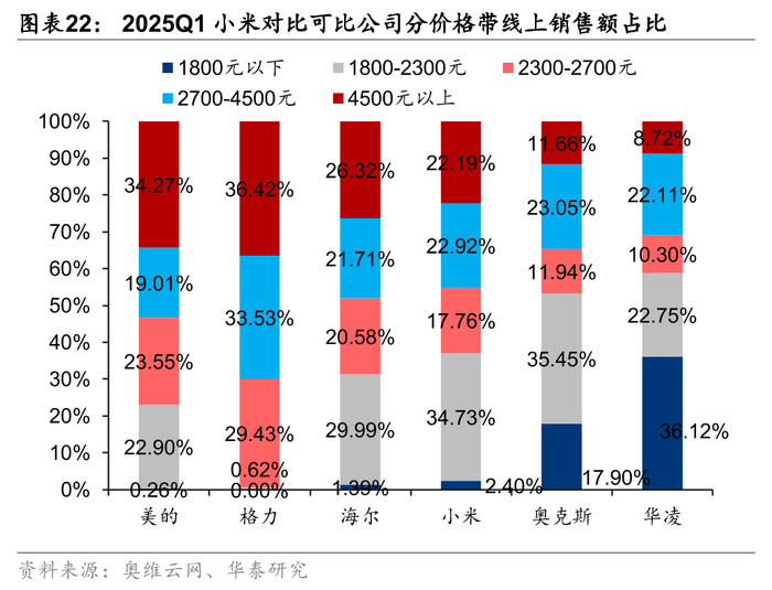根据奥维云网数据,从分价格段来看,2024年小米空调销售主要集中在1500-1800元以及1800-2300元之间,占比分别达21%/36%,2300-2700元价格带2024年线上零售额同比+377.69%。2025Q1小米空调销售区间上移至1800-2300元以及2300-2700元之间,这主要得益于其巨省电Pro型号爆款热销带动。