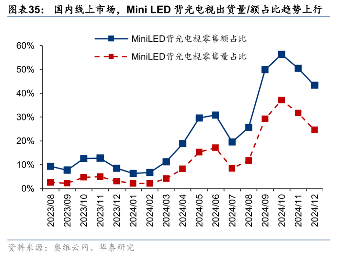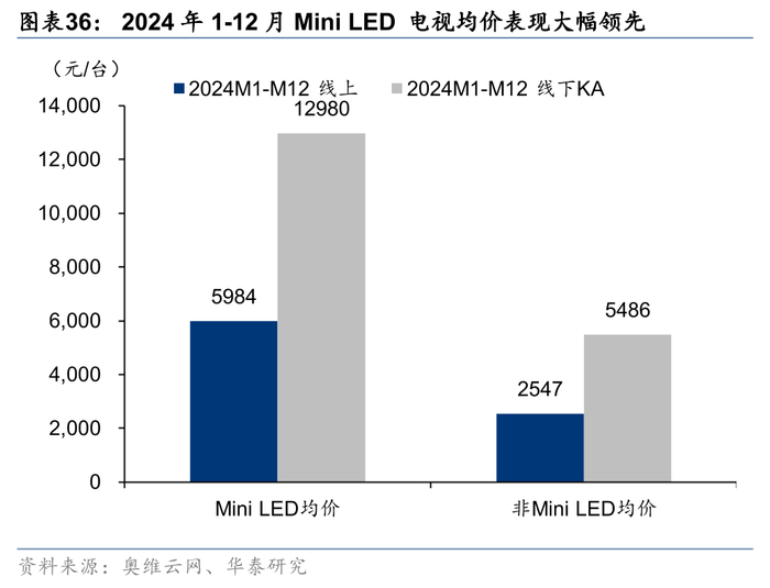 2024年Mini LED电视线上/线下KA均价为非MiniLED产品的2.17/2.15倍左右,2025年仍保持加持,其技术溢价高、毛利率优于传统产品。我们看好头部品牌通过Mini LED产品组合优化,继续推升2025年净利润率。