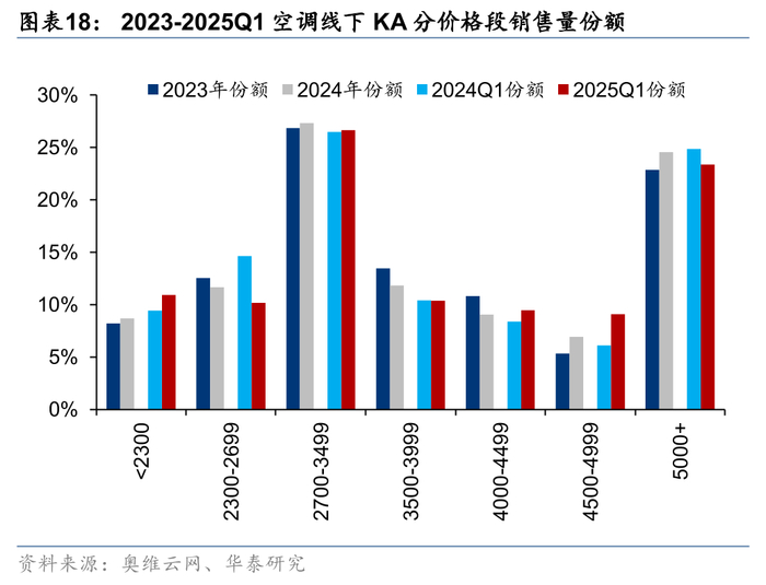 耐用品消费功能性价值诉求更强,2024年以来空调线上市场性价比需求有明显增长(1800元以下产品销售量占比从2023年的13.8%,提升至2024年的20.9%,25Q1依然同比提升),而线下KA市场为保持盈利仍以中高端产品为主(销售量占比最高的仍为2700-3499元价格段),高端产品份额仍有所提升(尤其以4000元以上价格段)。