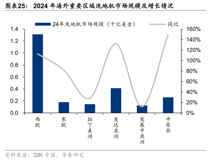 2024年海外扫地机、洗地机市场保持高增长。IDC数据显示,2024年海外扫地机出货量超1500万台,同比+12.9%。另据GfK海外市场监测数据,2024年扫地机、洗地机在海外大多数区域均保持双位数增长,如西欧、东欧扫地机销额同比增长超20%,日韩等发达亚洲扫地机销额同比增长15%左右。