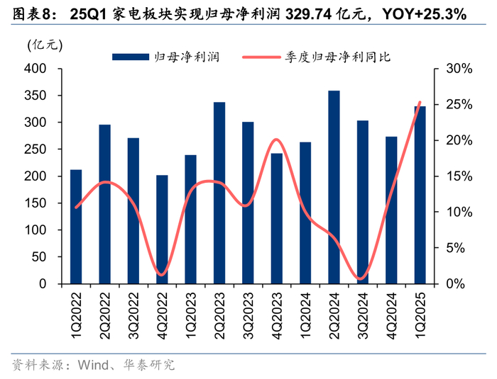 25年伊始,行业抢出口效应显现,25Q1板块整体实现营业总收入4244.6亿元,YOY+13.7%,实现归母净利329.74亿元,YOY+25.3%。