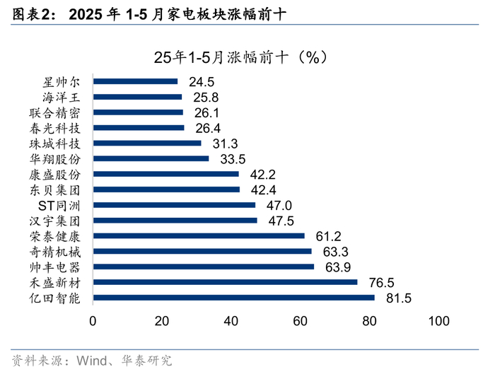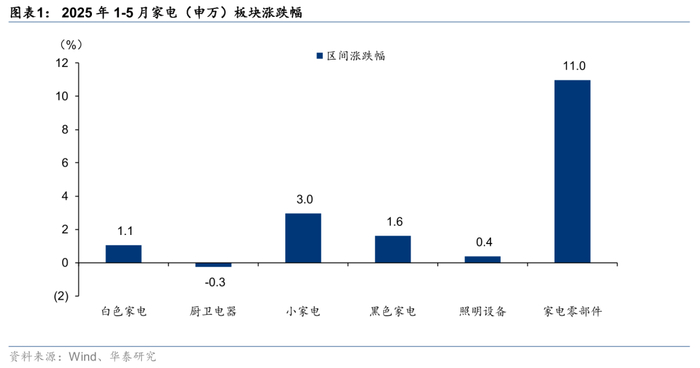2025年1-5月,家电(申万)板块上涨约1.9%,在30个申万子行业中处于中上游。但相对上证综指及沪深300,家电板块仍有超额收益。各细分板块中,家电零部件(受益于机器人、AI+等相关产业高热度)涨幅较大(+11%)。