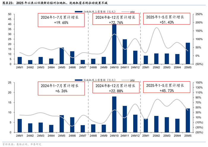 以旧换新补贴对需求的拉动效果不减。自去年8月扫地机、 洗地机纳入地方性家电以旧换新补贴范围以来,国内扫地机、洗地机市场迎来显著增长。奥维云网线上监测数据显示,24Q4扫地机、洗地机线上零售额同比分别为+86.7%、+31.7%,今年1-5月延续增长势头,扫地机、洗地机线上零售额分别为61.2亿元、41.7亿元,同比分别为+51.4%、+45.7%。