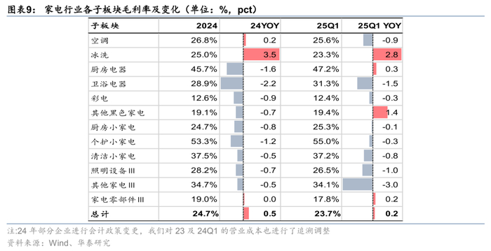 受到大白电板块的毛利率优化拉动,24年家电板块毛利率同比+0.5pct,25Q1仍同比+0.17pct。但整体来看,高价原材料仍对其他细分板块的毛利率产生了不利影响。各个细分子板块,24年卫浴电器、厨房电器板块毛利率同比降幅较大。