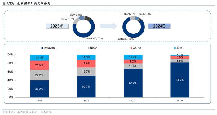 3#运动相机:影石Insta360占据绝对的领先地位。影石创新作为全球运动相机领军品牌,新品推出周期在半年至一年,按推出的时间主要有ONE X系列、GO系列、ONE R系列以及Ace系列。当前全球消费级全景相机竞争格局中,Insta360销售额遥遥领先于其他头部玩家,2023年Insta360销售额占全球全景相机销售额的67%,预计2024年市占率将进一步提升至82%(弗若斯特沙利文数据)。通过全景技术赋能运动相机,影石创新正在通过先进的软件技术重新定义运动相机行业,全景运动相机将成为未来新的红利赛道。