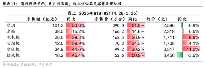5月高频零售数据表现积极,尤其以空调(旺季开启)和扫地机增速较高。但我们也要关注到,外销承压的背景下,更多企业将目光转向国内市场,行业竞争更为激烈,不同品类线上均价表现有明显分化(尤其以空调、冰箱价格压力较大)。而电视品类在Mini LED技术升级的拉动下,均价表现更为领先,我们认为电视龙头企业内销盈利表现或更为积极。