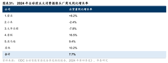1#智能安防:继承海康基因,萤石网络消费摄像头出货量第一。2013年海康威视部署互联网C端业务并创立“影石品牌”,当年发布智能摄像机“小熊猫”C1,之后陆续推出C2S、F2、S1等系列,产品矩阵丰富全面,覆盖室内、室外、无网无电等安防场景,并延伸至老人、母婴、宠物看护等领域,精细的场景化智能应用和客群适配,持续推动智能家居摄像机向视觉化、场景化、智能化升级,品牌优势不断巩固。根据IDC数据,2024年萤石摄像头出货量同比增长8.2%,蝉联消费摄像头全球出货量第一位置。