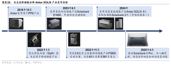 2#阳台储能:安克Anker SOLIX 3年快速赶超成为全球行业第一梯队参与者。安克从2015年开始尝试储能业务并推出了第一款储能产品便携式电站,2023年安克聚焦家庭储能行业,确立储能系列的新产品品牌名“Anker SOLIX”,2023年-2025年已发布三代Solarbank阳台储能系统,获得市场认可和成功。欧睿国际根据2024年全球销售额数据,授予Anker“全球No.1阳台储能品牌”市场地位认证,24年安克创新储能业务营业收入30.2亿元,同比+184%。