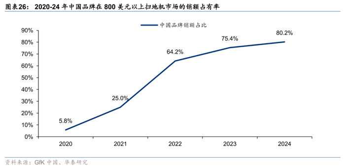 中国品牌已成为海外市场的中流砥柱。凭借出色的产品性能和多年的海外市场运营,2024年中国品牌在扫地机、洗地机国际市场实现了从跟随到引领的身份转变。GfK海外市场监测数据显示,2024年海外(不含北美、俄罗斯,下同)800美元以上扫地机市场中,中国品牌的销额占比超8成,市场话语权较2020年显著提升。