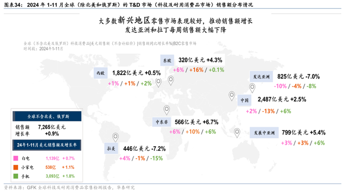 美国关税政策不改国内创新型企业的全球化扩张道路。虽然美国仍是全球最大的消费市场,但对科技消费企业而言,广大的欧洲、亚太、拉美等区域提供了广阔的增长空间。根据GFK在2025年1月发布的《全球科技及耐用消费品市场&中国品牌出海发展趋势》,2024年1-11月全球(除北美和俄罗斯)的T&D市场(科技及耐用消费品市场)销售额达7265亿美元,其中新兴地区零售额增长更快,中东非和发展中亚洲国家(除中国)的销售额分别达566和799亿美元,分别同比增长6.7%和5.4%。2015年以来,中国品牌通过跨国并购、成立合资企业、设立海外研发中心等方式,快速获取国际资源,2024年中国科技品牌海外零售市场销售额已达410亿美元/占海外整体市场销售额9%。我们认为中国品牌将以创新为驱动,在高科技、绿色经济和数字化领域提升全球竞争力,实现高质量发展。