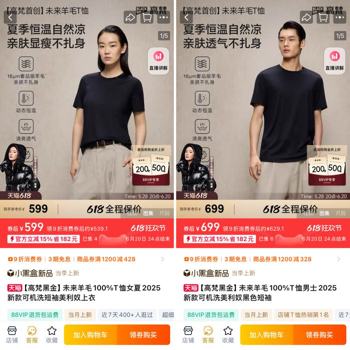 新品延续了高梵鹅绒服一贯的特色——设计简约,以高品质用料为卖点,价格定位中高端。这两款T恤均为黑色纯色T恤,区别主要是男女款的版型差异,号称是高梵在米兰的户外奢研中心“专为亚洲身型设计”。两款新品都宣称采用了柔软的100%超细美丽诺羊毛,以及德国的纱线技术,还有恒温和抑菌功效。两款产品售价分别为699元和599元。
