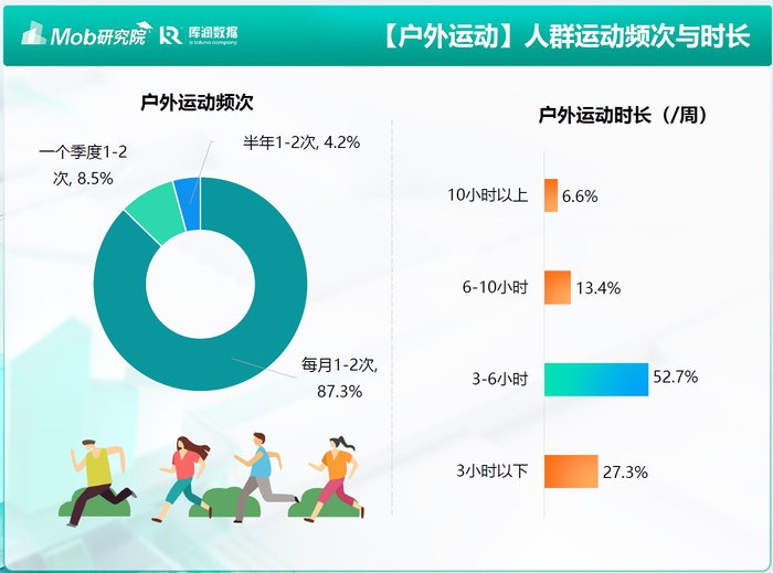 调研机构Mob研究院发布的《2024年户外运动人群洞察报告》显示,参与户外运动人群的动机主要是缓解压力、强身健体和亲近自然,这些远高于社交需求;近九成受访者每月都会进行户外运动,运动偏好主要是骑行、徒步、登山和露营,52.7%的用户每周户外运动时长3-6小时。