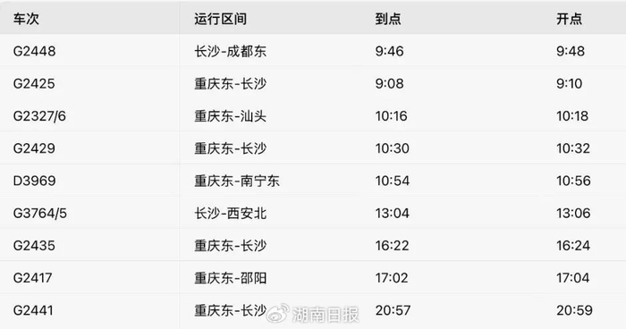 此外,7月1日起,全国铁路将实行新列车运行图。根据目前已公布的湖北来凤站、咸丰站两个车站7月1日起开行、停靠的车次表,从重庆东到长沙的车次共有4趟,分别为G2425、G2435、G2441、G2429次;重庆东到张家界西的G4601次列车;重庆东到邵阳的G2417次列车;长沙到重庆东的列车,G2432、G2438次。
