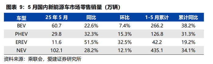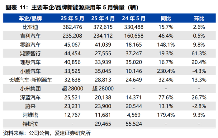 5月比亚迪销量行业领先。5月,比亚迪新能源车销量382,476辆,同/环比分别+15.7%/+2.6%;吉利汽车销量235,208辆,同/环比分别+46.4%/+0.5%;零跑汽车销量45,067辆,同/环比分别+148.1%/+9.8%;鸿蒙智行销量44,454辆,同/环比分别+19.3%/+61.3%。
