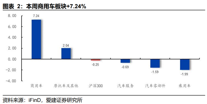 本周汽车板块跑输沪深300指数0.60个pct。本周申万汽车板块报收6,923.1点,下跌0.85%,板块排名19/31,同期沪深300指数报收3,864.2点,下跌0.25%。子板块方面,商用车板块+7.24%;摩托车及其他板块+2.04%;汽车服务板块-0.69%;汽车零部件板块-1.59%;乘用车板块-1.99%。