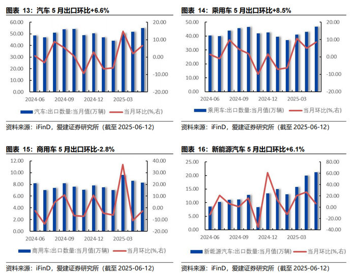 5月国内乘用车出口同环比上升。据中汽协数据,5月国内汽车出口55.1万辆,同/环比分别+14.6%/+6.6%。分车型看,乘用车出口46.8万辆,同/环比分别+17.9%/+8.5%;商用车出口8.3万辆,同/环比分别-1.2%/-2.8%;新能源汽车出口21.2万辆,同/环比分别114.1%/+6.1%。