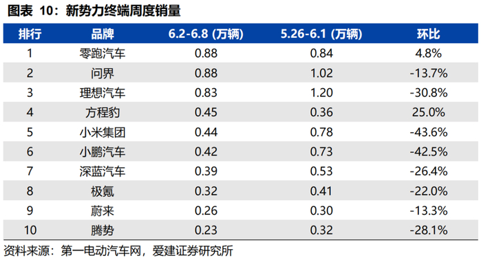零跑汽车新势力周度销量居榜首。6月2-8日,零跑汽车0.88万辆,问界0.88万辆,理想汽车0.83万辆,方程豹0.45万辆,小米集团0.44万辆,小鹏汽车0.42万辆,深蓝汽车0.39万辆,极氪0.32万辆,蔚来0.26万辆,腾势0.23万辆。