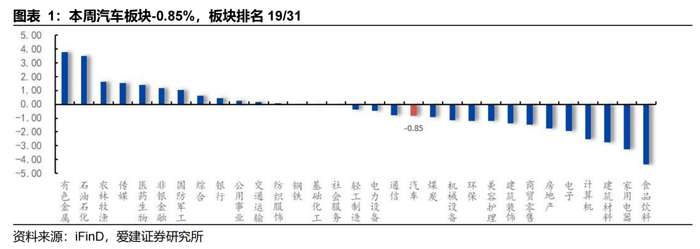 ■车企账期缩短存不确定性,受此影响本周汽车板块下跌0.85%。本周众多车企官宣缩短供应链账期,此举理论上可缓解供应商资金压力,但落地细则未明或导致市场担忧车企现金流与供应链稳定性存在不确定的压力与风险。受此影响,本周申万汽车板块报收6,923.1点,下跌0.85%,板块排名19/31,同期沪深300指数报收3,864.2点,下跌0.25%,本周汽车板块跑输沪深300指数。子板块方面,商用车/摩托车及其他/汽车服务/汽车零部件/乘用车板块,分别+7.24%/+2.04%/-0.69%/-1.59%/-1.99%。