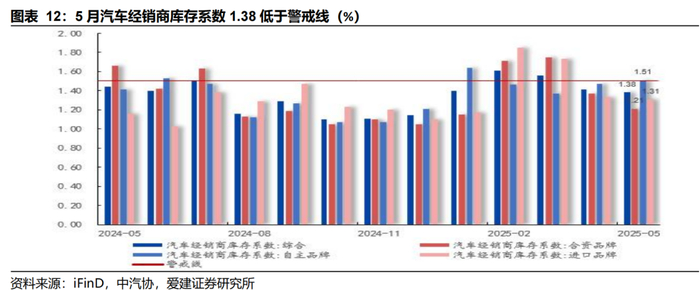 5月综合库存系数1.38低于警戒线,同环比下降。由于5月厂商生产态势较好,5月厂商批发高于生产4万辆,而厂商月度国内批发低于零售7万辆,5月乘用车厂商加渠道总体库存下降11万辆(去年同期下降9万辆)。5月,汽车经销商综合库存系数1.38,同/环比分别-4.2%/-2.1%;合资品牌库存系数1.21,同/环比分别-27.1%/-11.7%;自主品牌库存系数1.51,同/环比分别+7.1%/+2.7%;高端豪华&进口品牌库存系数1.31,同/环比分别+12.9%/-1.5%。