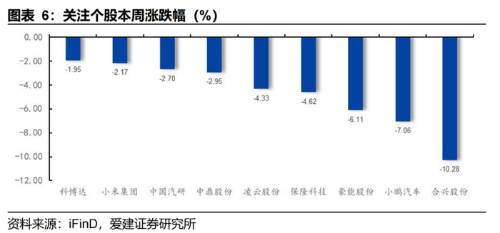 科博达(-1.95%)、小米集团(-2.17%)、中国汽研(-2.70%)、中鼎股份(-2.95%)、凌云股份(-4.33%)、保隆科技(-4.62%)、豪能股份(-6.11%)、小鹏汽车(-7.06%)、合兴股份(-10.28%)。