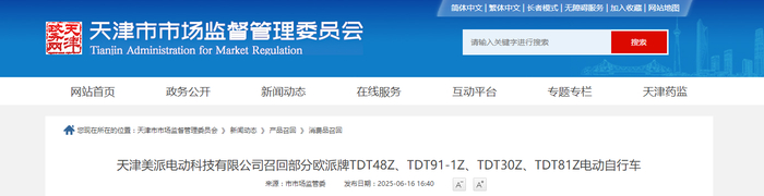 天津美派电动科技有限公司召回部分欧派牌TDT48Z、TDT91-1Z、TDT30Z、TDT81Z电动自行车